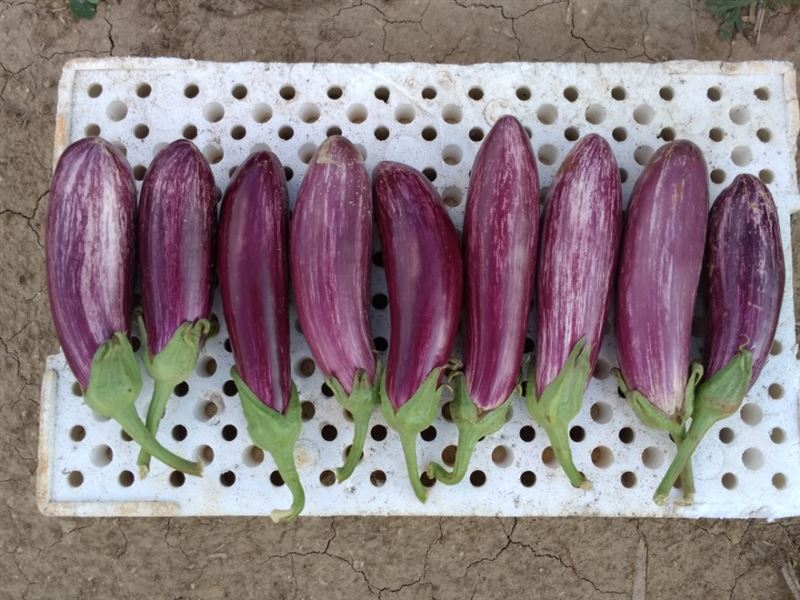 Καρποί επιμήκεις μήκους 18-23 cm, με έντονα γυαλιστερό μωβ-κόκκινο χρώμα και άσπρες ρίγες που δεν μεταβάλλεται στις υψηλές θερμοκρασίες.